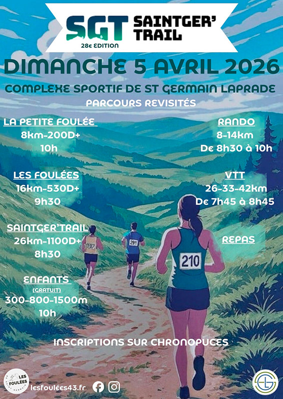 Le club « Les Foulées de Saint Germain Laprade » situé dans le 43 (à mi-chemin entre Saint Julien Chapteuil où est organisé le Capito’Trail et le Puy en Velay (Ville organisatrice du Grand Trail de Saint Jacques) organise le 05 avril 2026 la 28ème édition baptisée « SAINTGER’TRAIL » au complexe sportif.